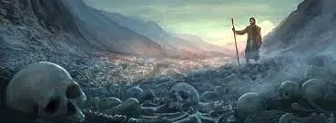 Im Falle eines Atomangriffs verkürzt sich unser Heimweg kollektiv auf Mikrosekunden vor dem letalen Einschlag. Auch in diesem Falle wäre »der uns Liebende« permanent gegenwärtig. Der »Lebendige« beherrscht das Totenreich, indem er es gar nie zulässt! »Ezechiel wird von Gott in eine Ebene voller Knochen geführt. Dort fragt Jachweh Ezechiel: „Menschensohn, können diese Gebeine wieder lebendig werden?“ Noch während er ihnen neues Leben prophezeit, fügen sich die Gebeine zusammen. Auf Geheiß Gottes hin kehrt schließlich Fleisch, Haut und zuletzt sogar die Lebenskraft der Toten zurück«. Ez 37,1-14. Lesen und blättern sie bitte mutig weiter!